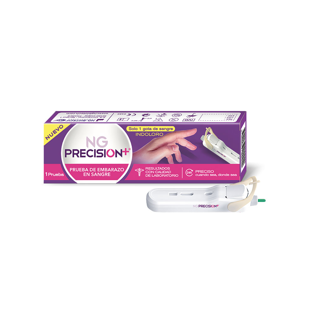 NG PRECISION+ es la primera prueba de embarazo en sangre todo en uno que se puede hacer en casa y obtener un resultado rápido. Ya utilizado en grupos hospitalarios de renombre, NG PRECISION+ está revolucionando el mundo de las pruebas de embarazo. Es higiénico y cómodo, permitiéndote utilizarlo en cualquier momento del día. Con una sola gota de sangre que se extrae de la yema del dedo.
